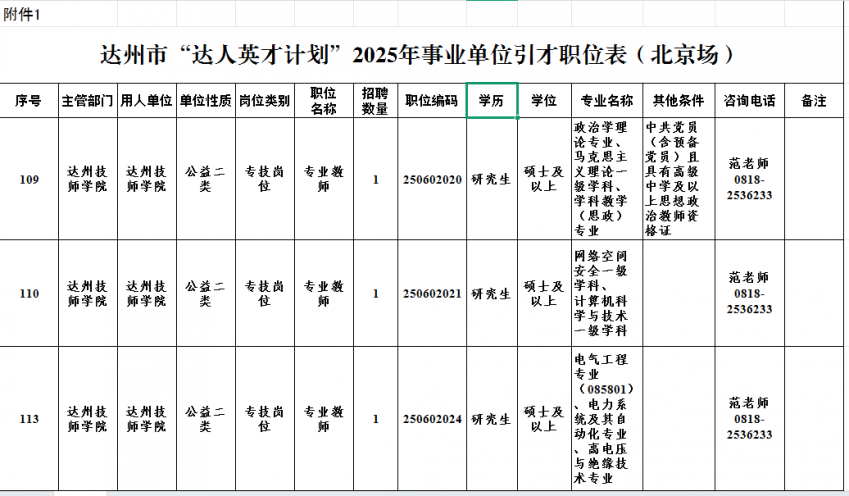 达州技师学院2025年下半年公开引进专业教师正在报名!我校带编引才3名