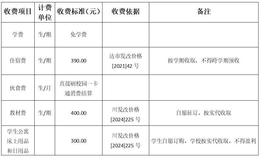 达州技师学院收费公示