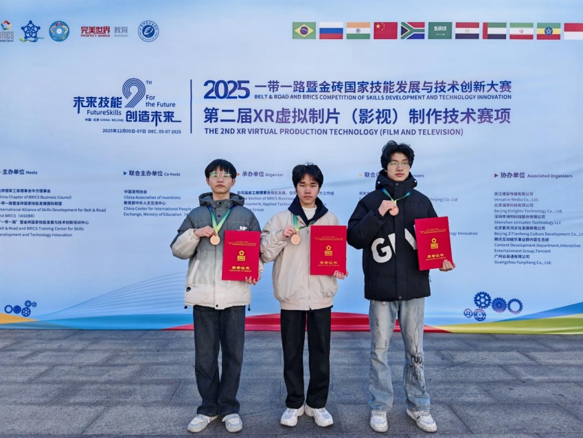 发布时间:2025-12-1012月7日,“2025一带一路暨金砖国家技能发展与技术创新大赛——第二届XR虚拟制片(影视)制作技术赛项”全国总决赛在北京落下帷幕。我校参赛团队徐继乐、黄荣、孙福川(指导教师:王稀、李华东)三位同学,凭借扎实技能与创新表现,成功跻身全国前30强并晋级总决赛,最终荣获全国三等奖。
