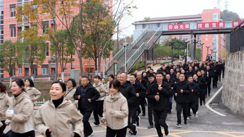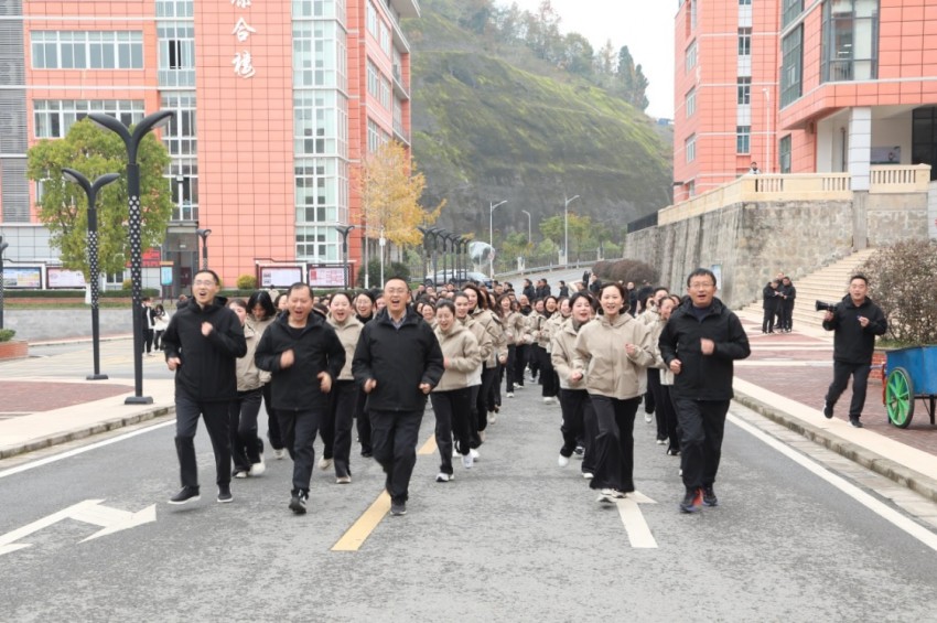 在校园欢乐跑活动项目中,教职工分成五个纵队,随着一声哨响,老师们步伐轻盈而有力,高喊着“携手共进、运动同心、团结协作、共创佳绩”的口号,向着目标不断前进,这一刻他们不仅是教书育人的引路人,更是追求健康、享受生活的奔跑者。