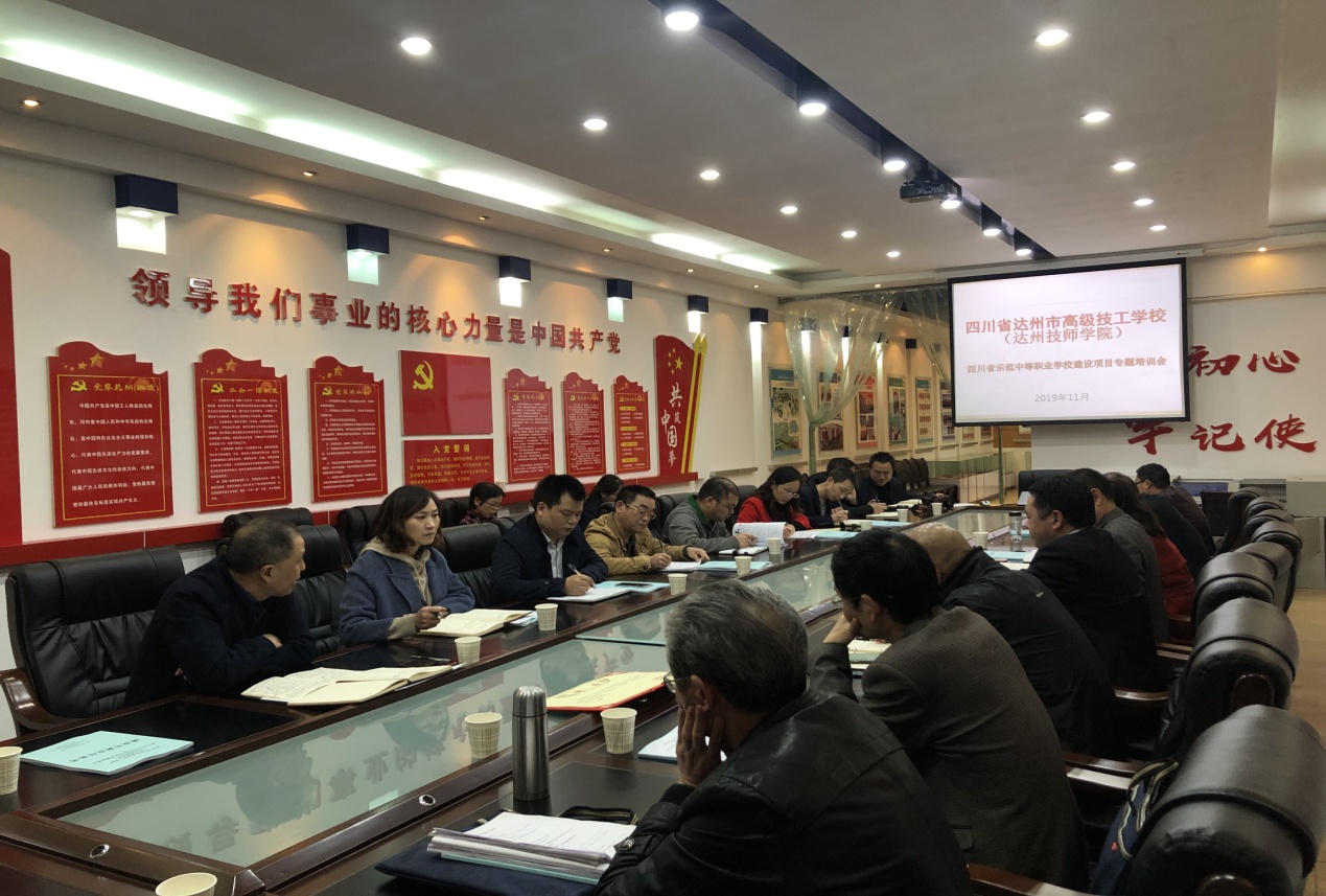 2019年11月12日下午,学院在党员活动室召开了四川省示范中等职业学校建设项目专题培训会。为加快创建示范校进度,学校特意邀请了高级教师、达县职业高级中学原“国示办”何三喜主任作专题培训。会议由学院党委委员、副院长张双全同志主持,学院部分党委领导班子成员及高级技工校区所有中层干部参加了此次会议。