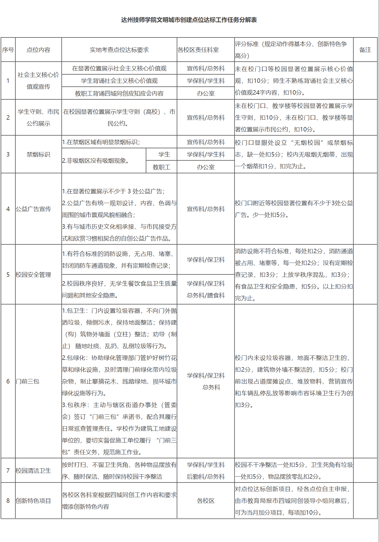 附件:达州技师学院文明城市创建点位达标工作任务分解表