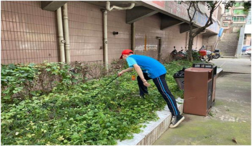 图为志愿者清除花台垃圾