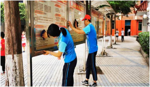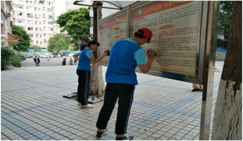 图为志愿者清洁校园文化专栏