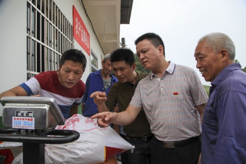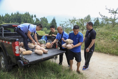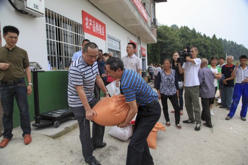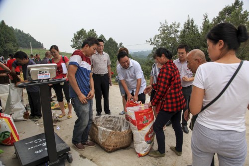 图为学校党员干部纷纷帮助农户搬运、计量农产品