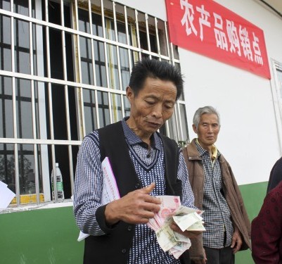 图为农户喜滋滋地清点卖农产品的大把钞票
