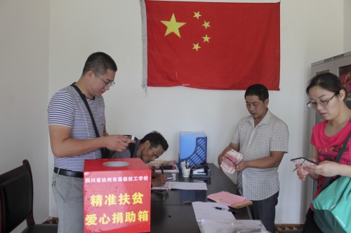图为学校中层干部和村社干部一起清点捐款金额