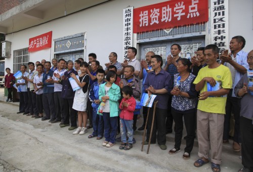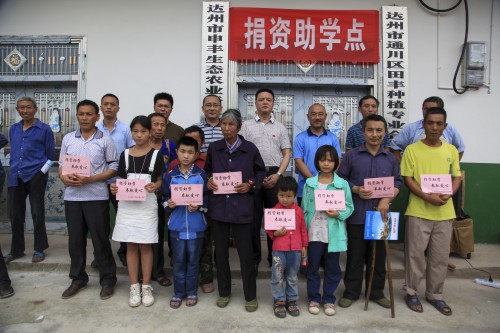图为学校领导、村社干部和受捐助的部分学生、学生家长留影