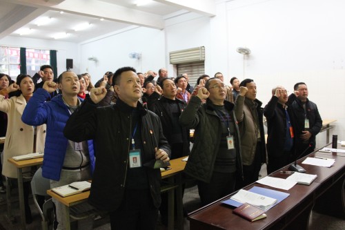 图为全体党员在总支书记李颂同志的带领下重温入党誓词